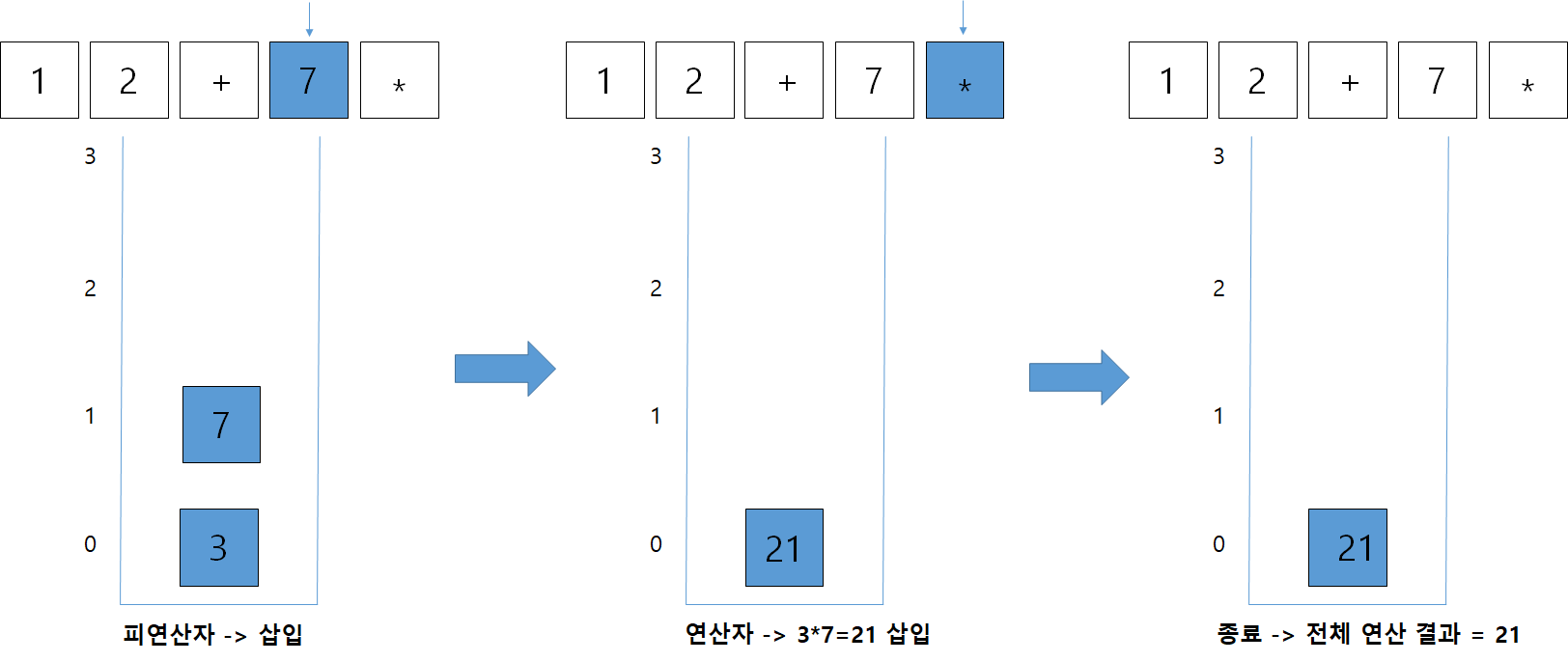 먼저 스택에 피연산자를 차례대로 넣는다. 그 후 연산자를 만나면 스택에서 피연산자를 꺼내어 나누기 연산을 한다. 만약 연산 시에 스택에 원하는 만큼의 피연산자가 없으면 오류를 발생 시킨다.