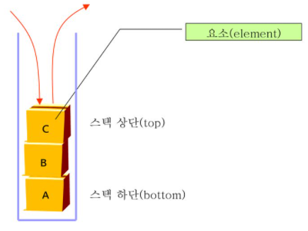 스택은 후입선출(LIFO)으로 창고에 쌓여있는 상자를 생각하면 이해가 쉽다. 만약 상자를 바닥에 A, B, C, D순으로 쌓았다면 하나를 꺼내려면 맨 위에 있는 D 상자를 꺼내야 한다. 스택에서 입출력은 맨 위에서만 일어나고 스택의 중간에서는 데이터를 삭제할 수 없다. 스택에서 입출력이 이루어지는 부분을 스택 상단(stack top)이라고 하고 반대쪽인 바닥부분을 스택 하단(stack bottom)이라고 한다. 스택에 저장되는 것을 요소(element)라 부른다. 스택에 요소가 하나도 없는 스택을 공백 스택(empty stack)이라고 한다.