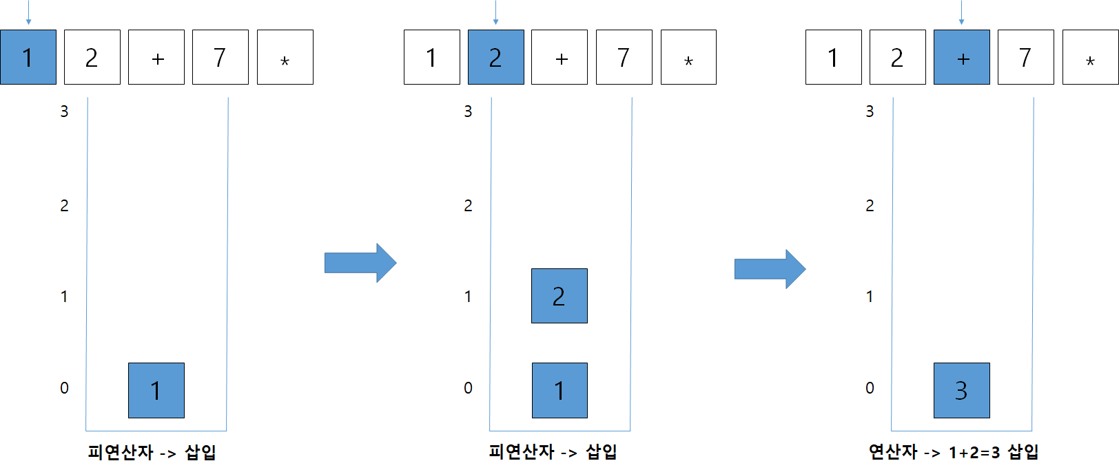 위의 (1+2)*7이라는 수식이 있을 때 후위 표기법으로 고칠 때 순서는 다음과 같다.